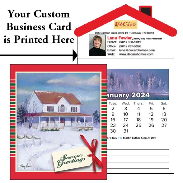 Each month features a seasonal image and an area for notes. YOUR CHOICE OF 10 COVERS. Comes with FREE Envelopes. 3½ x 6¼ calendars come with FREE “Gift for You Envelopes” and mail at the 1 oz. rate. Due to the heavy weight, a $3.00 per 100 surcharge will be added to our regular shipping.