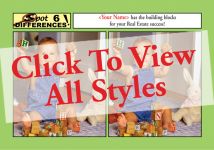 Spot 6 Differences!ReaMark’s Exclusive “Spot 6 Differences” Postcards These will be the first pieces they notice when they get the mail and won’t put them down until they find the answers. And once they do, they will pass it along to their spouses and friends. Just imagine your advertising being looked at by so many potential clients for so long. Your name is featured on the front and back of each card. We offer over 60 different product choices. Just click below to view all styles. Remember, as always YOU WILL receive a FREE proof of your design(s) within 24-48 hours. YOU WILL not be charged for you order until you approve the proof(s). With over 21 years in business you can order with confidence with ReaMark Real Estate Products. Order our 6 card or 12 card kit and save even more.