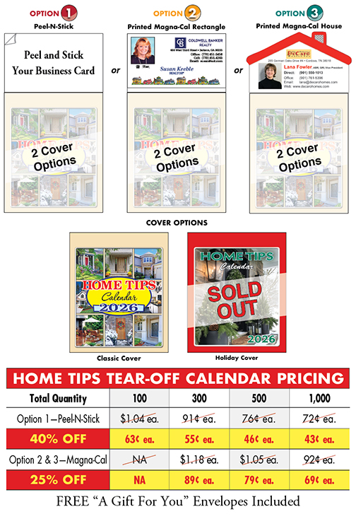 You get 12 months of helpful home tips that YOUR CLIENTS WILL LOVE and refer to all year long. 3½ x 6¼ calendars come with FREE “Gift for You Envelopes” and mail at the 1 oz. rate. Due to the heavy weight, a $3.00 per 100 Surcharge will be added to our regular shipping. 3 Topper Options: Peel off the liner and apply your business card to magnet calendar. Ships in 5-7 days. OPTION 2 - Magna-Cal Rectangle or OPTION 3 - Magna-Cal House– Your info printed on a Business card or house shape magnet. Free Proofs within 48 hours. Production time is 8-10 Bus days. |